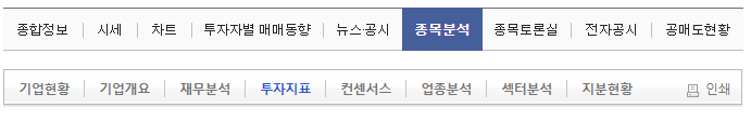 1. '종목분석' 클릭 후 아래와 같은 화면이 나오면 '투자지표'를 클릭합니다.