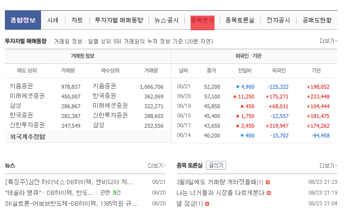 2. 종목명 검색 후 아래와 같은 화면이 나오면 '종목분석'을 클릭합니다.