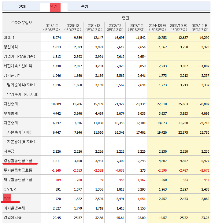 예로 든 기업의 영업활동 현금흐름(OCF)은 2018년 이후 장기간 정(+)을 유지하고 있습니다. FCF(Free Cash Flow)는 2022년까지 정(+)으로 유지되다가 2023년에 부(-)를 기록하여 좀 더 알아볼 필요가 있습니다. FCF가 부(-)여도 투자할 가능성은 있습니다.